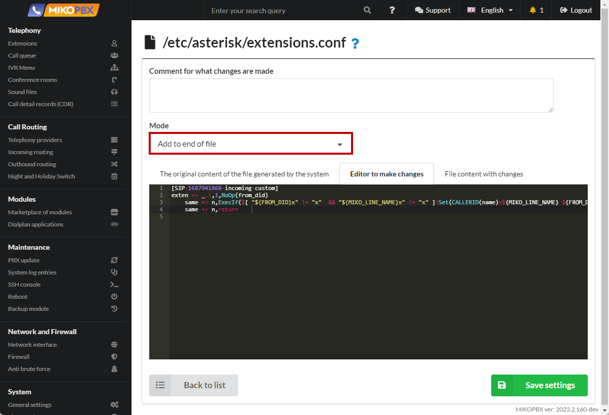 <figure><img src="https://835495363-files.gitbook.io/~/files/v0/b/gitbook-x-prod.appspot.com/o/spaces%2FsZ8acWnNlSalIHQjMFu1%2Fuploads%2FNuELWVzuFh5rThr08jvu%2FEditExtensions.conf.png?alt=media&#x26;token=567dc075-00ed-45a7-bc10-915ccc1dc97f" alt=""><figcaption><p>extensions.conf file</p></figcaption></figure>