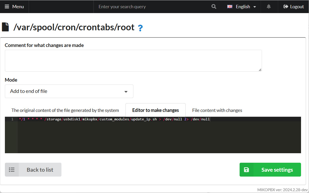 <figure><img src="https://835495363-files.gitbook.io/~/files/v0/b/gitbook-x-prod.appspot.com/o/spaces%2FsZ8acWnNlSalIHQjMFu1%2Fuploads%2F3oCGDajpSgvgg7Sm5MBG%2FediditngFile.jpg?alt=media&#x26;token=269278f7-fb06-499e-a92c-796d34e1d93c" alt=""><figcaption><p>Editing file crontabs/root</p></figcaption></figure>