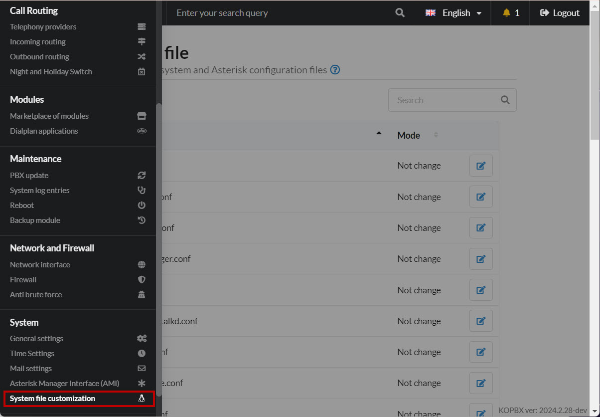 1. Go to the MikoPBX web interface → "**System"** → "**System file customization":**