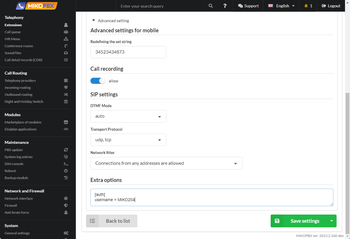 Auth name - username for authorization. In the case of MikoPBX is equal to the internal number