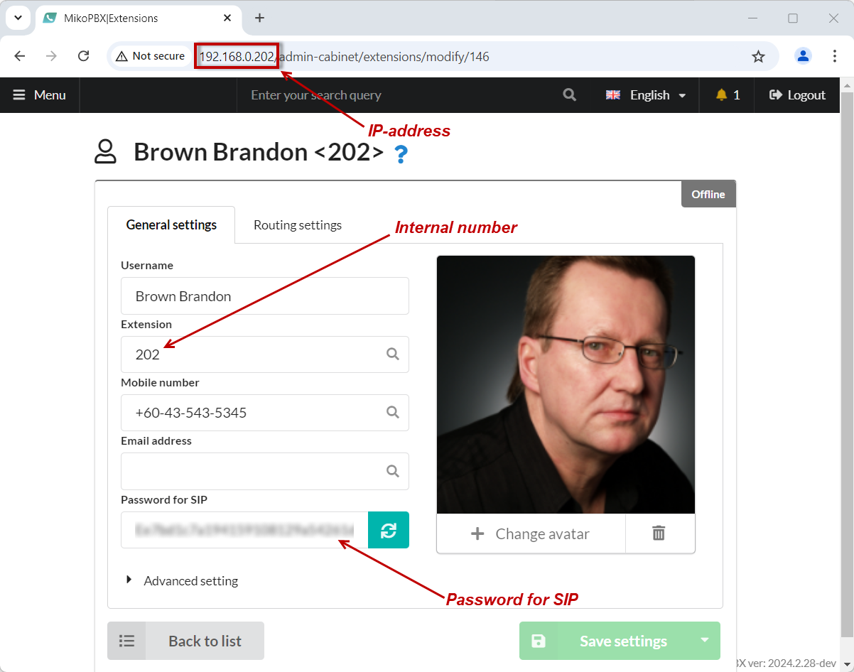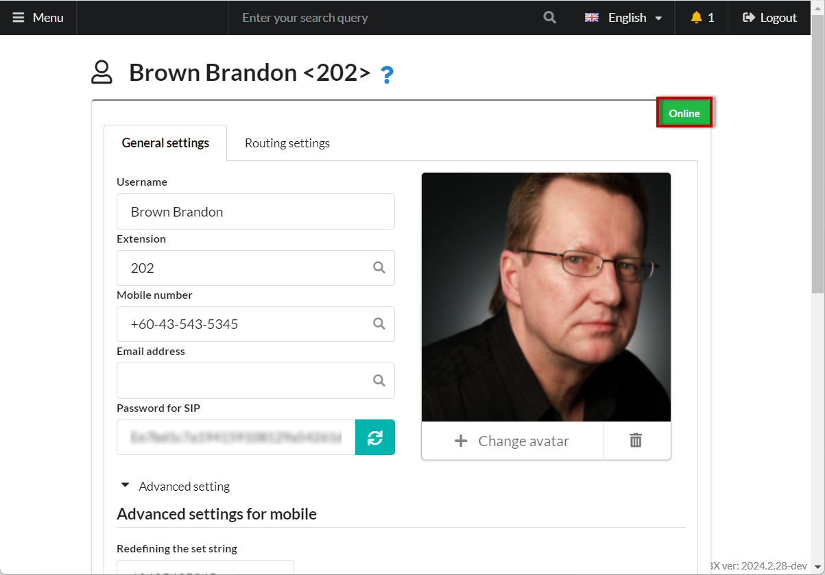 9. The softphone will automatically register with the **PBX**, and next to the employee's name, the status "<mark style="color:green;">Online</mark>" will appear.