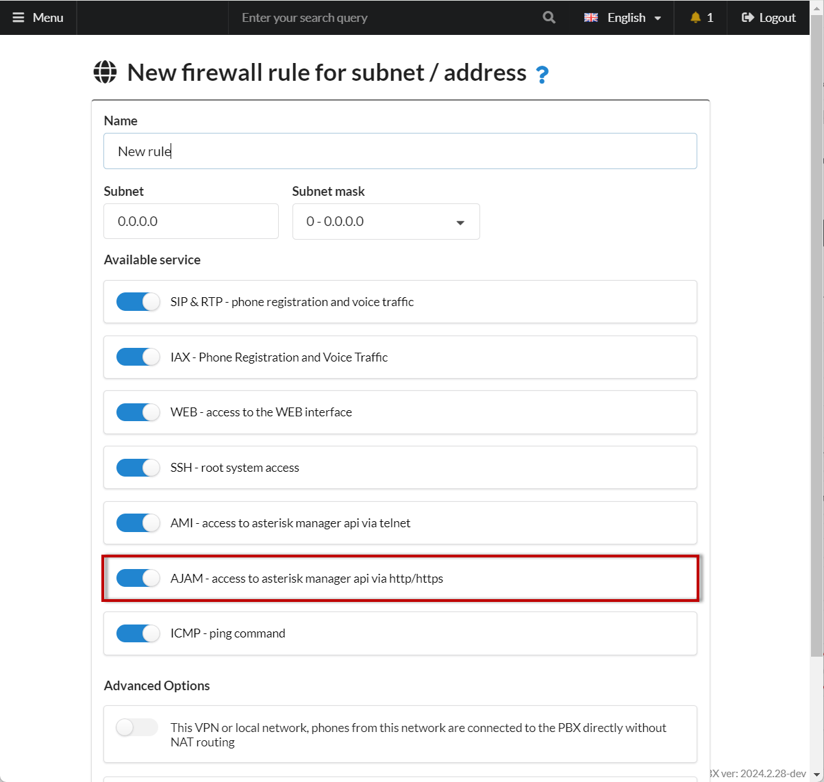 3. In MikoPBX, go to **Network & Firewall** → **Firewall**, and add the subnet 0.0.0.0 with a mask of 0.0.0.0. Enable access via AJAM.