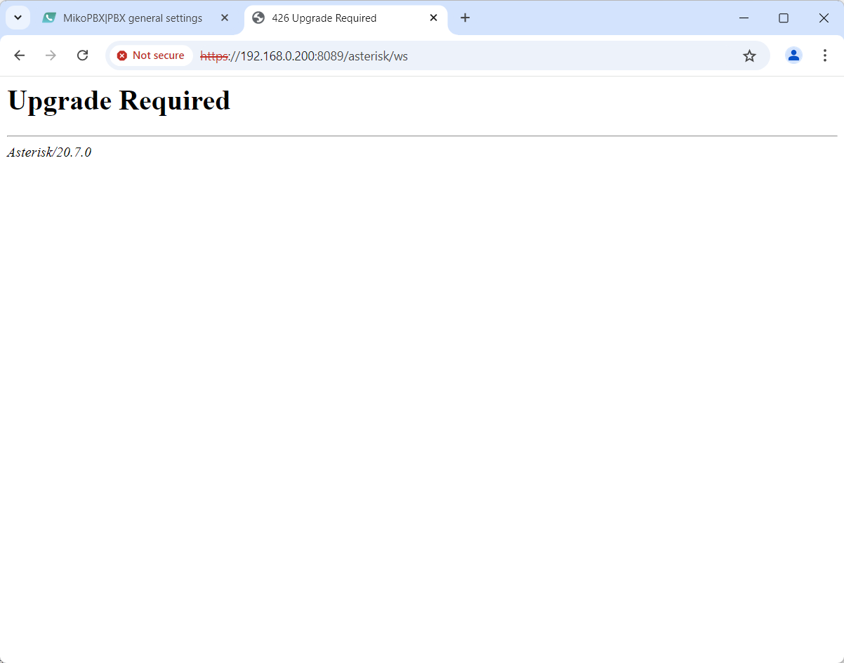 6. Open the link in your browser: [**https://PBX\_ADDRESS:8089/asterisk/ws**](https://xn--_-7sbbof9dici:8089/asterisk/ws). Use Chrome, as other browsers may have issues. If the certificate is self-signed, you might see a warning "**Connection is not secure**", ignore it and click "**Proceed to the website**."