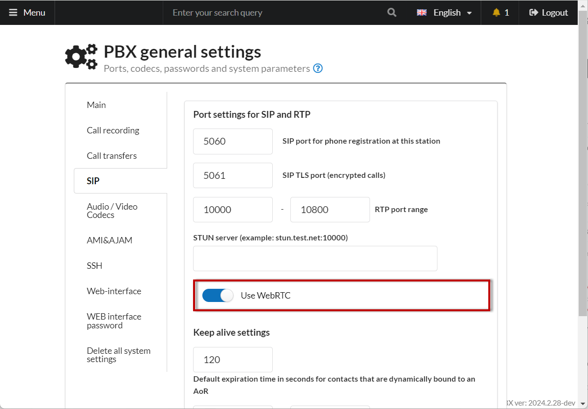To do this, go to **System → General Settings → SIP** and enable the "**Use WebRTC**" toggle switch.