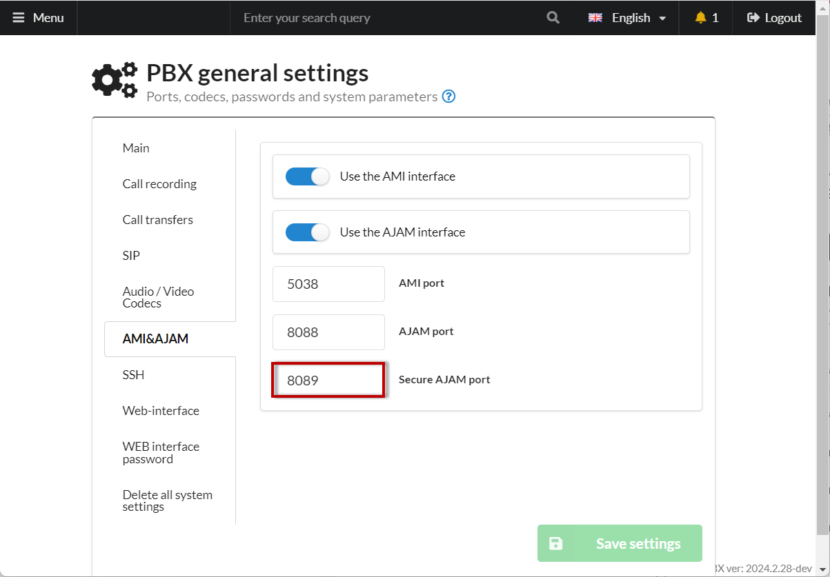 4. Go to **System** → **General Settings** → **AMI & AJAM**. Ensure the "**AJAM Port with Encryption**" is set to **8089.**