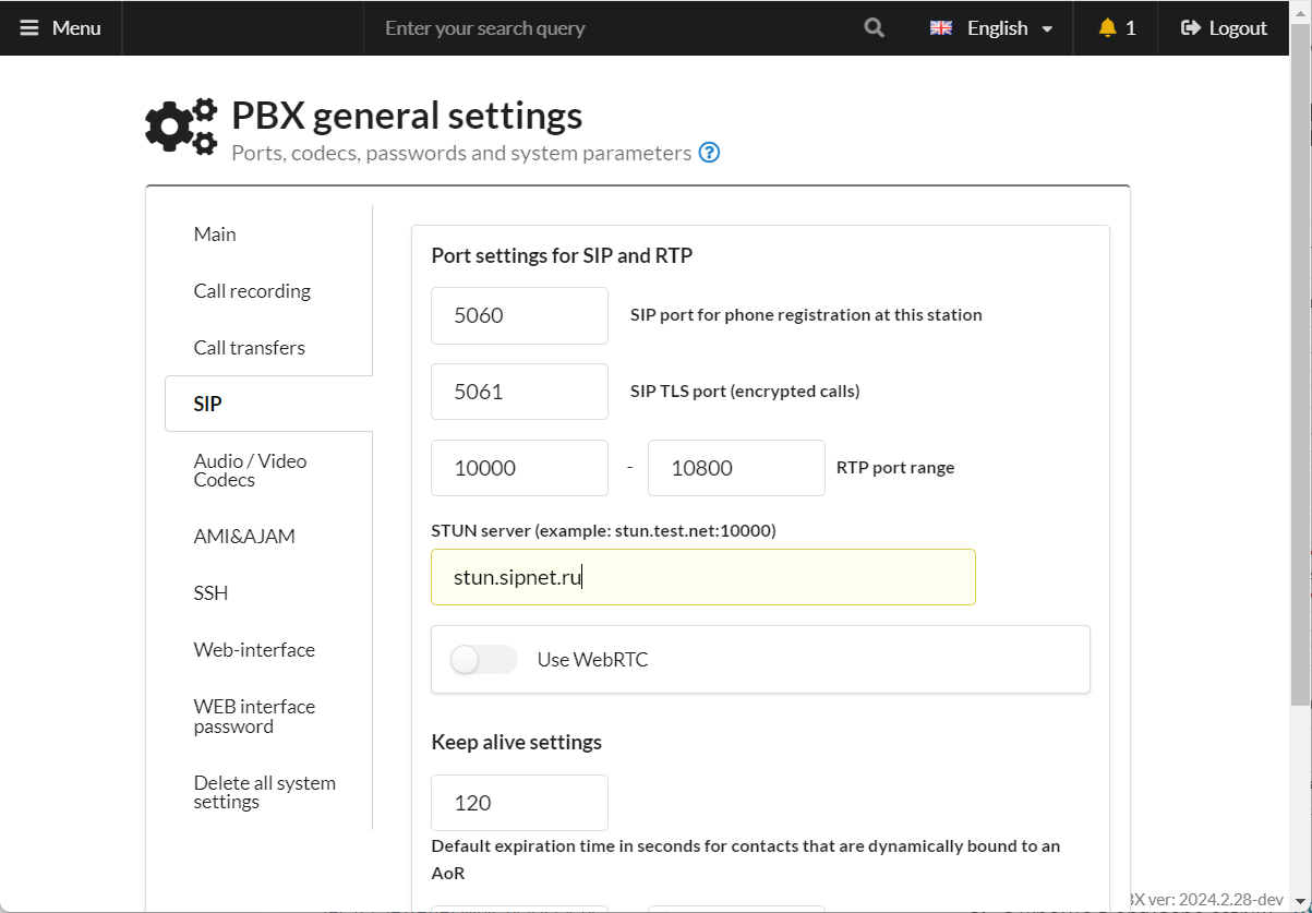5. In the [**General Settings**](https://docs.mikopbx.com/mikopbx/english/manual/system/general-settings) section, specify the STUN server address. For example, **stun.sipnet.ru**.