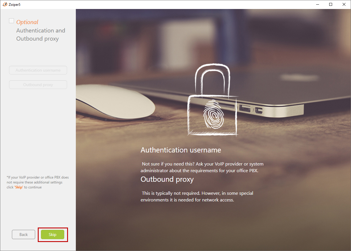 On the option Authentication and Outbound proxy without cocking the checkbox, click Skip.