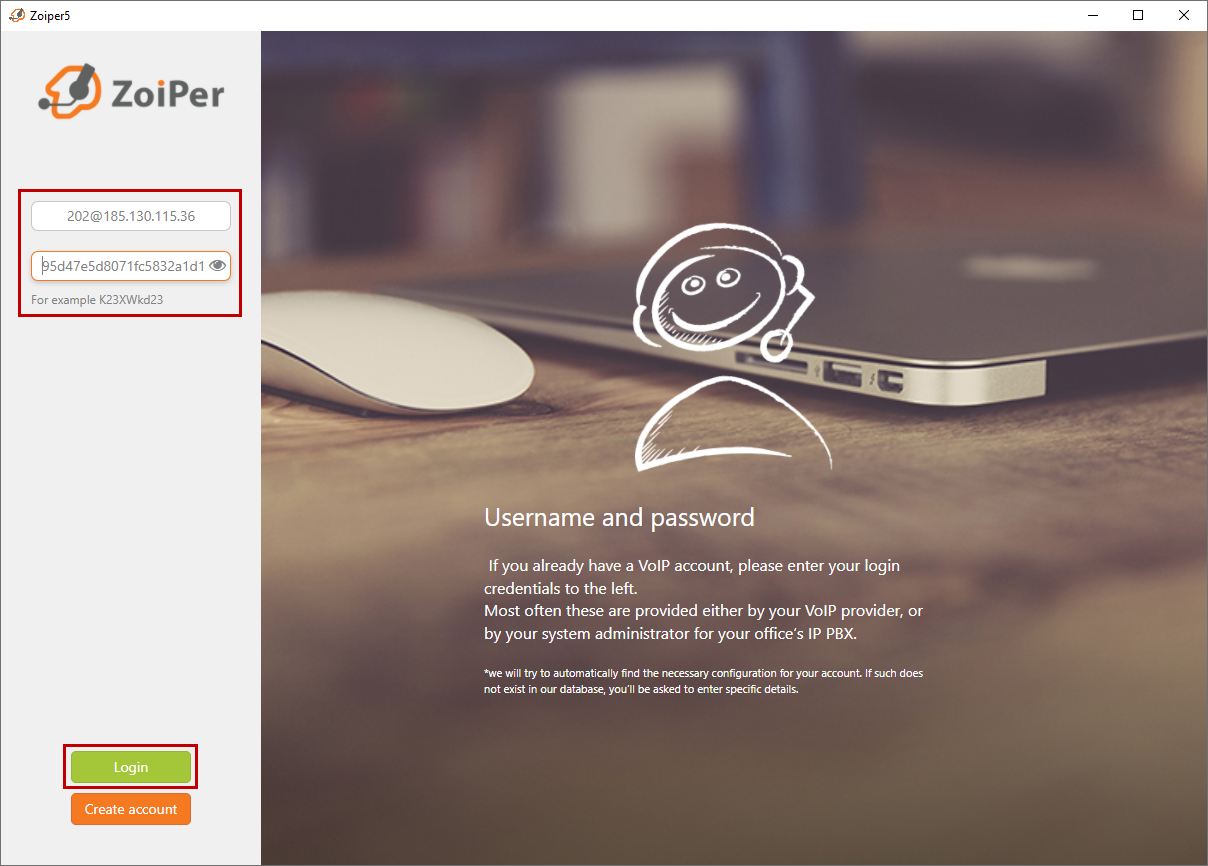 Launch the installed softphone. You will see the following window. It prompts you to enter login and password.