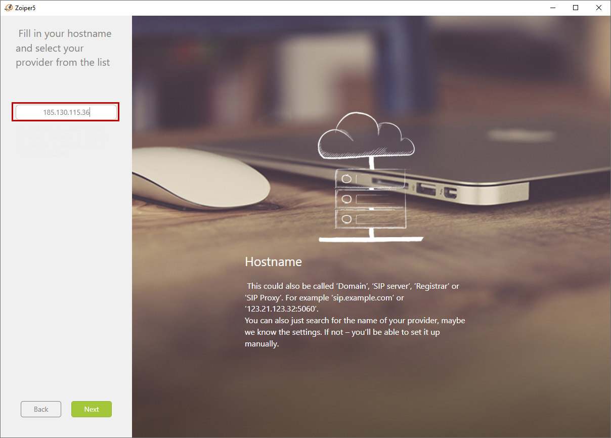 4. On the offer Fill In your hostname and select provider from the list, make sure that the address of your PBX is inserted in the field and click Next.