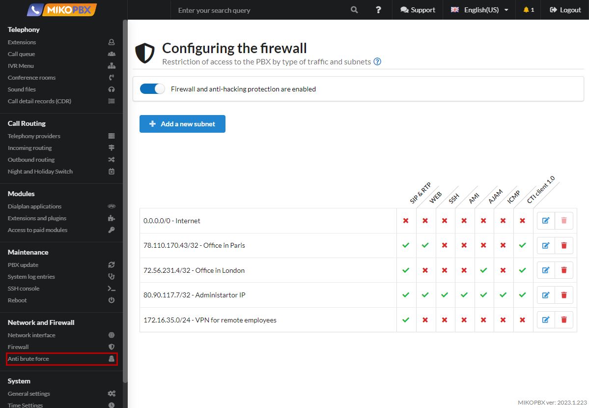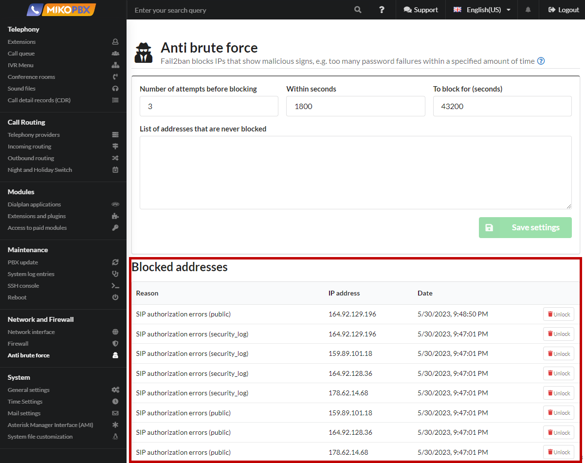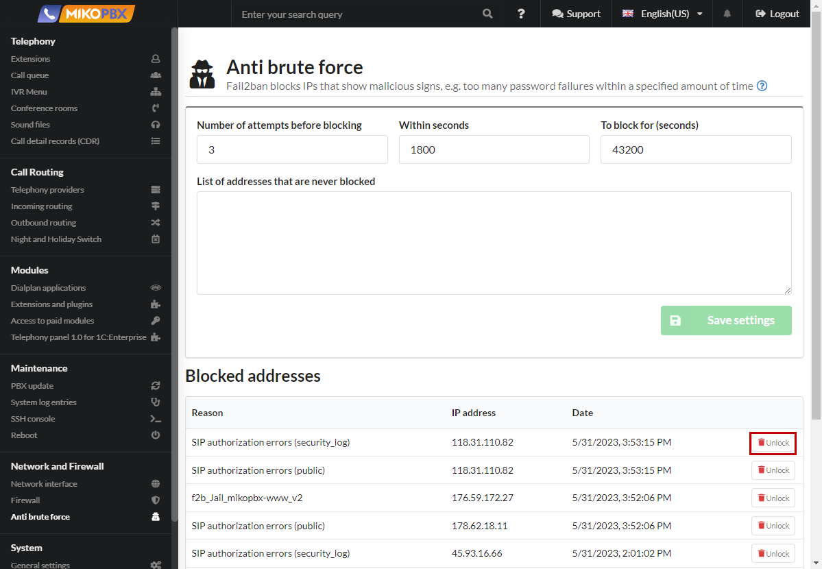 Fail2ban blocks IP addresses with abnormal activity. When there is a failed authentication attempt, information about the error will be logged in the PBX. Fail2ban analyzes all failed attempts and keeps track of them. When the number of failed attempts exceeds the maximum allowed authentication attempts, the IP address is banned. Fail2ban is capable of slowing down the rate of failed authentication attempts.
