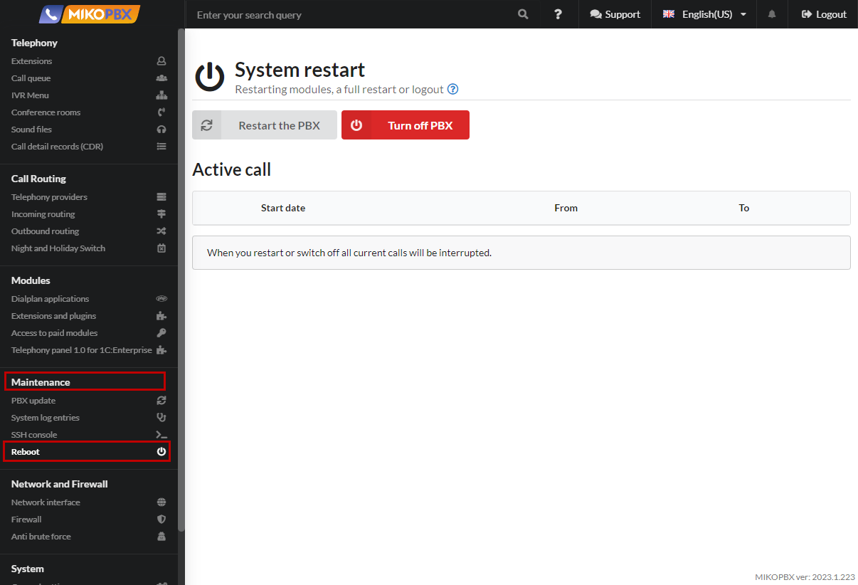 The system shutdown/reboot menu can be found in MikoPBX by clicking on "**Reboot**" in the "**Maintenance**" section.