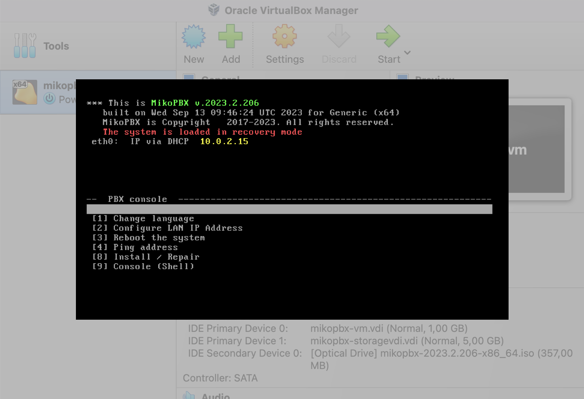 After the PBX reboots, the message "<mark style="color:red;">**The system loaded in Recovery mode**</mark>" will no longer appear, indicating that the PBX has booted from the hard disk and not from the virtual optical drive.\