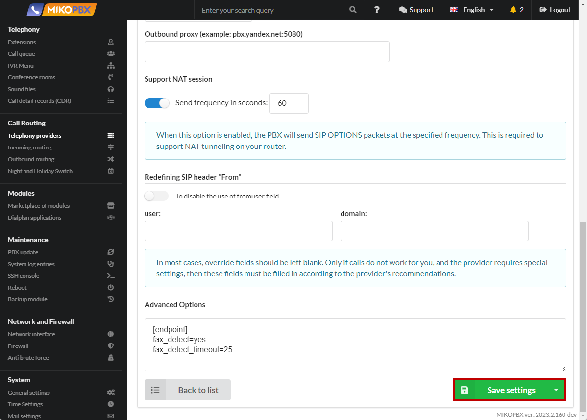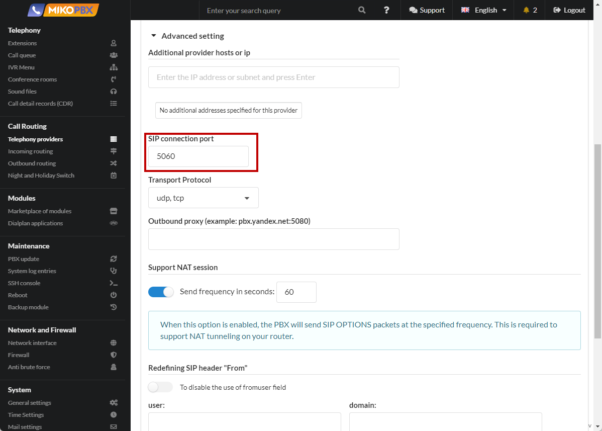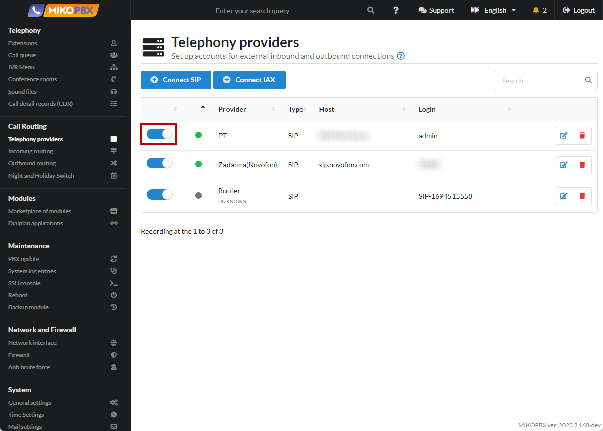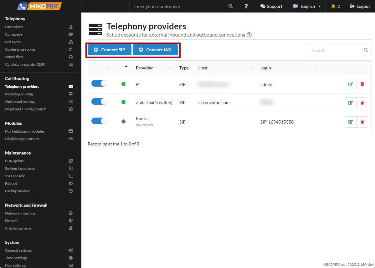 "Telephony Providers" in MikoPBX is a section of the system where connections to external telecom operators via Internet protocols for IP telephony are configured. Here, administrators can add and configure SIP trunk accounts or other types of connections that allow the system to make and receive calls from landline and mobile numbers.