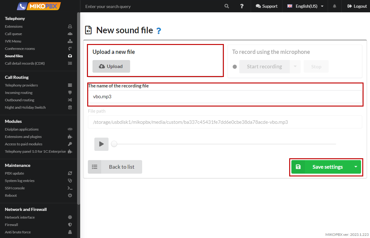 Additionally, there is the option to record a file using a microphone if you connect to the MikoPBX over HTTPS.