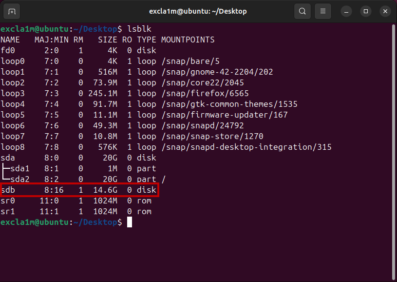 Find your USB drive in the list and remember its name. In our example, it is **sdb**.