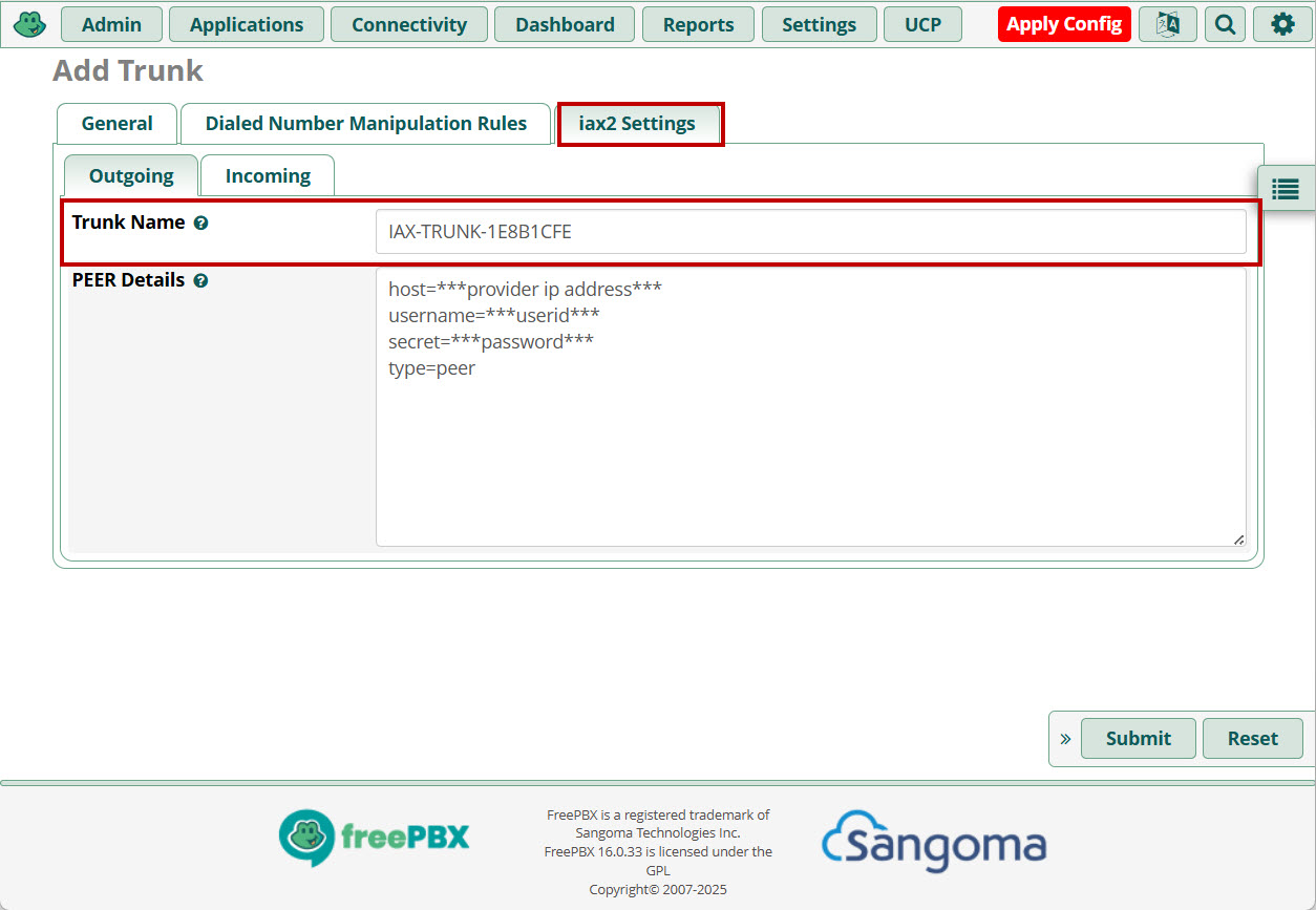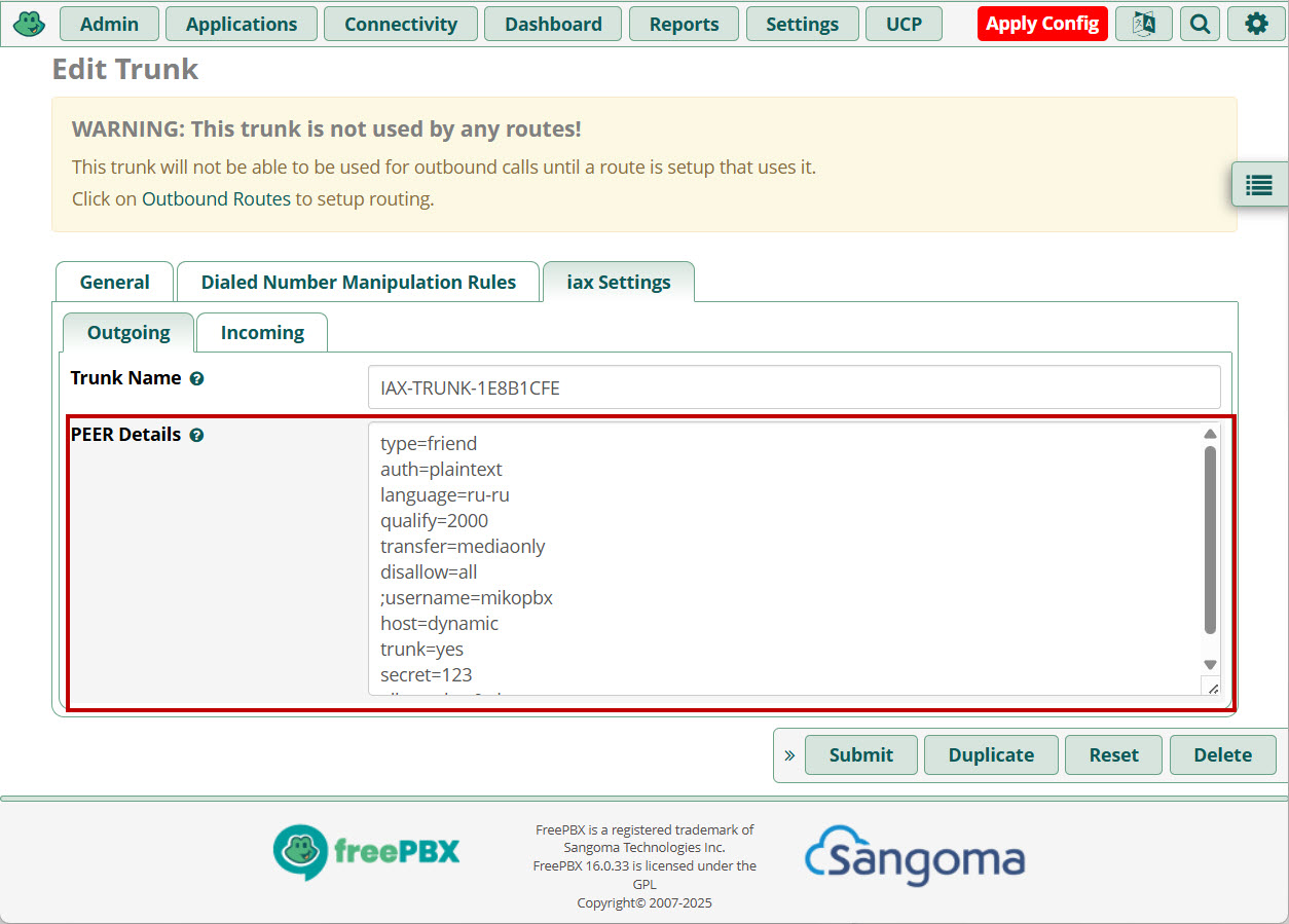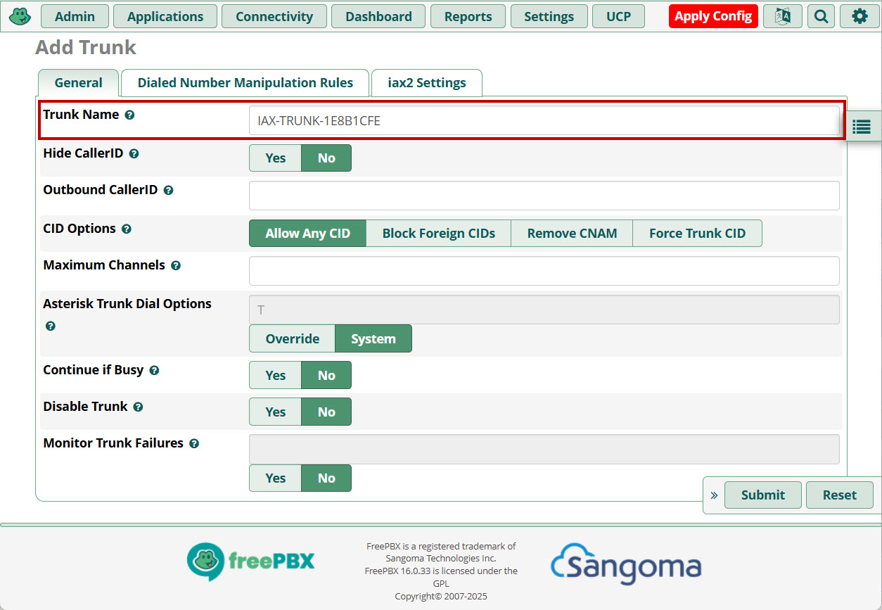 1. Перейдите в раздел «**Connectivity**» - «**Trunks**» и добавьте новый trunk **IAX2**