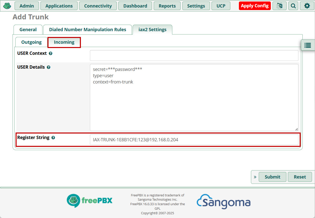 5. Во вкладке «**Incoming**» заполните поле «**Register String**» в формате "**LOGIN:PASSWORD\@IP\_FREE\_PBX**":