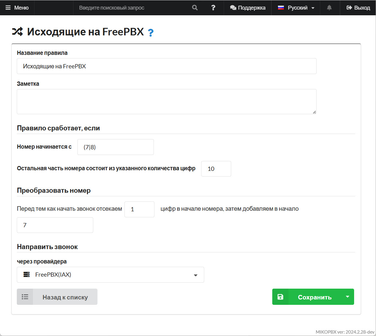 2. Опишите исходящую маршрутизацию ([см. руководство "Исходящие маршруты"](https://docs.mikopbx.com/mikopbx/manual/routing/outbound-routing)):