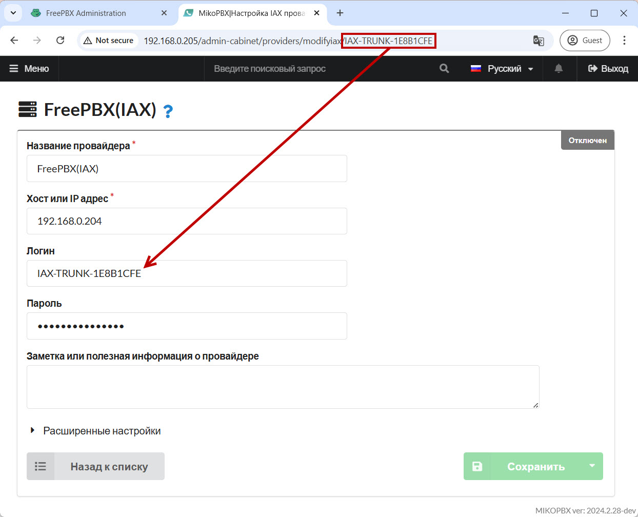 * "**Хост или IP адрес"** - IP адрес FreePBX.