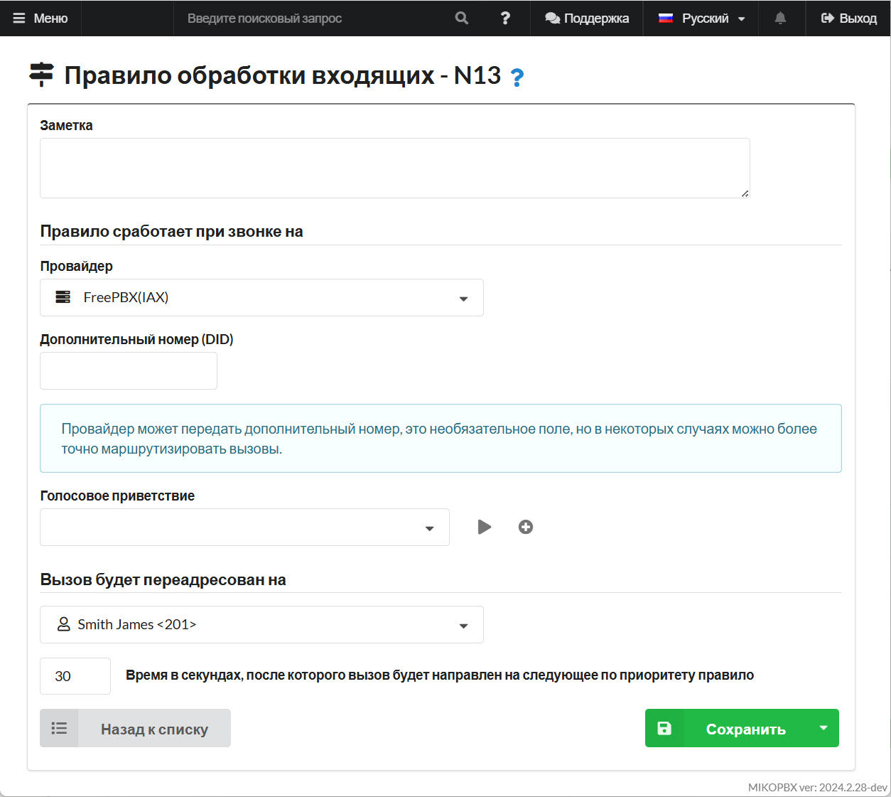 1. Опишите входящий маршрут ([см. руководство "Входящие маршруты"](https://docs.mikopbx.com/mikopbx/manual/routing/incoming-routing)). В данном случае, все вызовы будут направлены на внутренний номер 201: