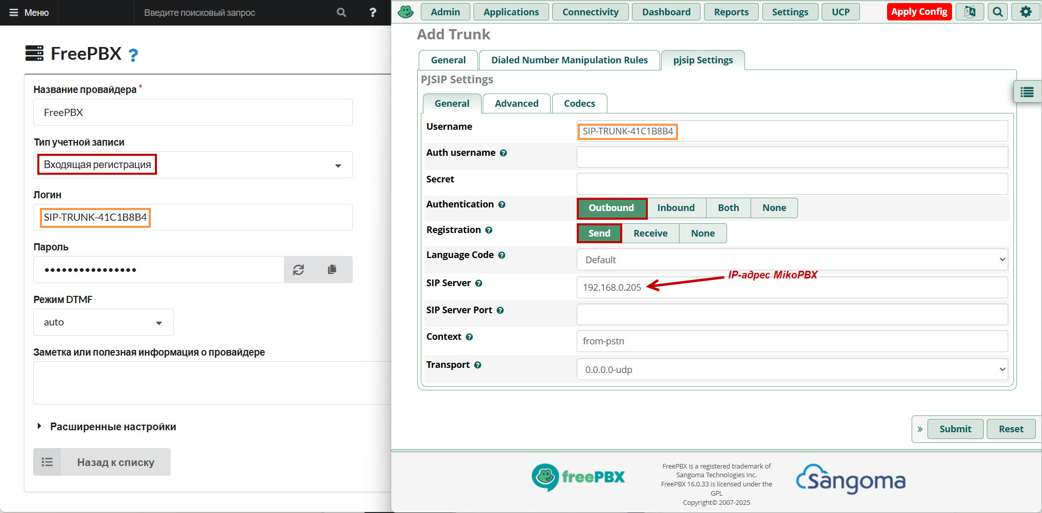 Регистрация FreePBX на MikoPBX