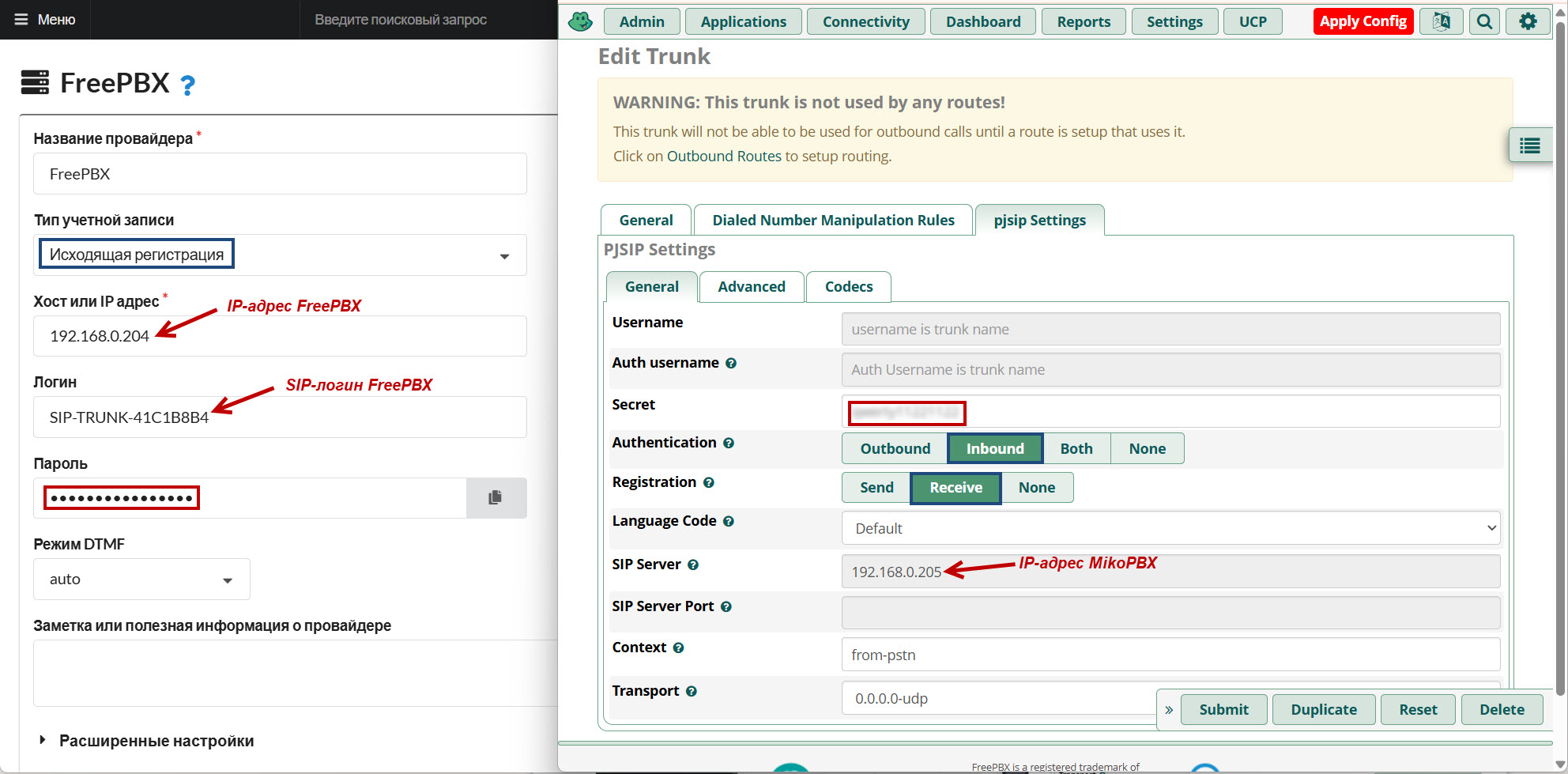 Объединение MikoPBX и FreePBX (PJSIP)