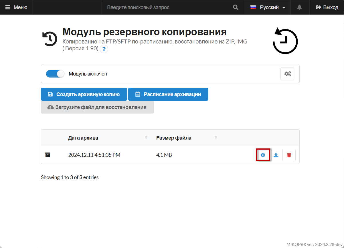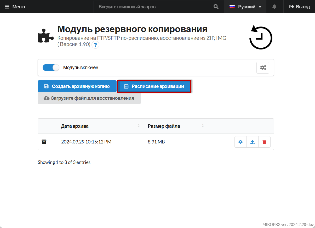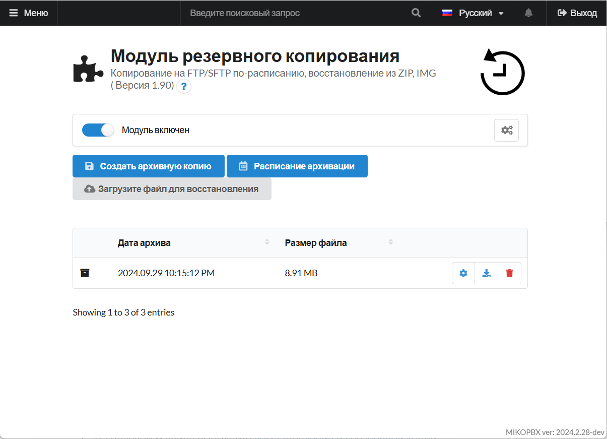 <figure><img src="https://3704471835-files.gitbook.io/~/files/v0/b/gitbook-x-prod.appspot.com/o/spaces%2F-MPK4TuzRBnP7rt8htho-887967055%2Fuploads%2F7ZKCURNFo7cq4Zjl51gm%2FModulePage.png?alt=media&#x26;token=710c70fd-fa2c-4edd-94ae-c8c392bd4ba6" alt=""><figcaption><p>Страница модуля резервного копирования</p></figcaption></figure>
