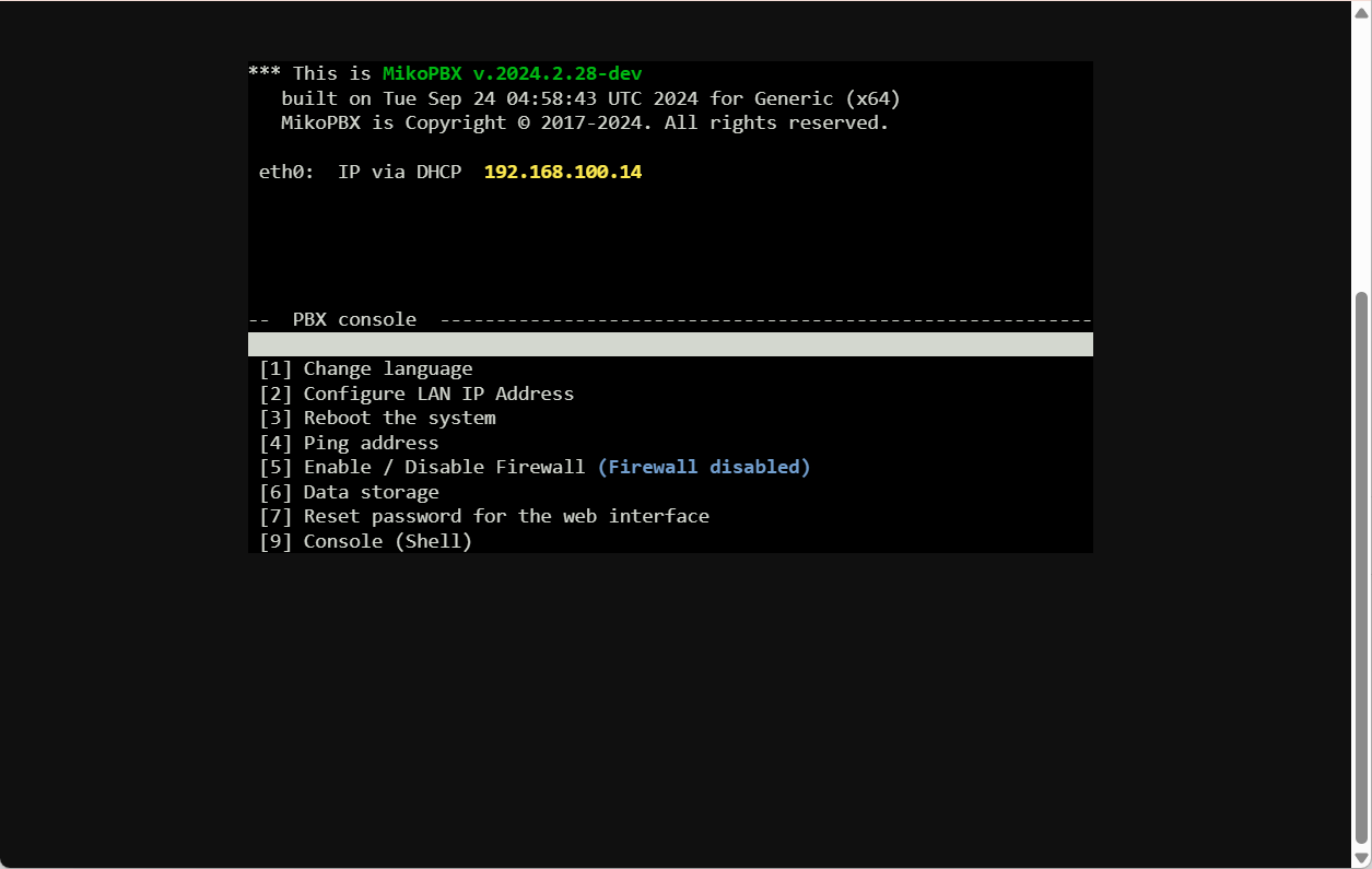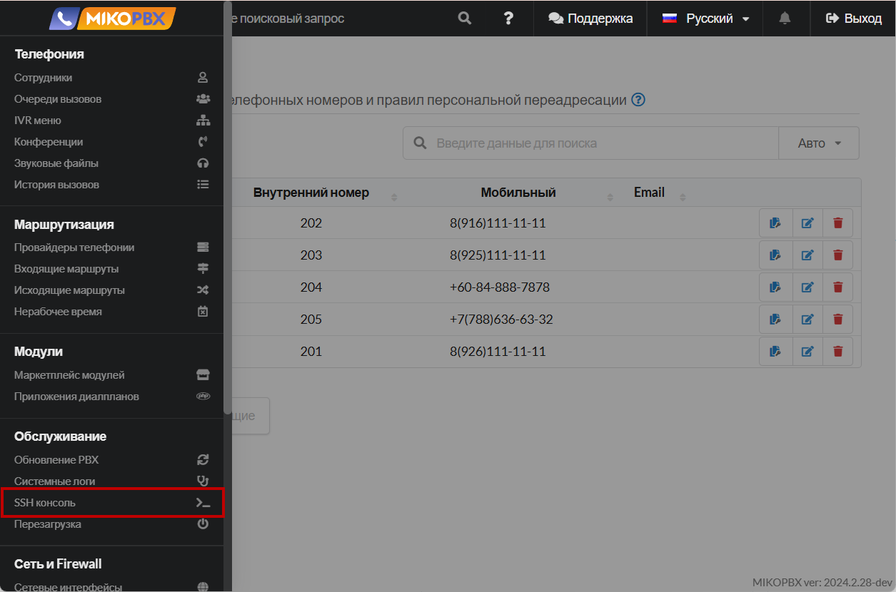 <figure><img src="https://3704471835-files.gitbook.io/~/files/v0/b/gitbook-x-prod.appspot.com/o/spaces%2F-MPK4TuzRBnP7rt8htho-887967055%2Fuploads%2F1FW69b0O5DpVKMGpExfK%2FSSHConsoleSectionMikoPBXWEB.png?alt=media&#x26;token=364eb227-c028-4d67-b0ba-8cad7c46af36" alt=""><figcaption><p>Раздел "Обслуживание" - "SSH консоль"</p></figcaption></figure>