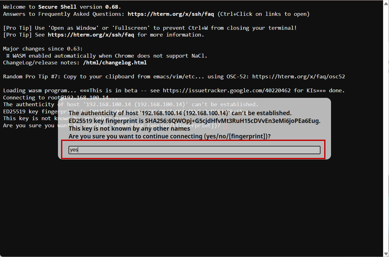 3. После переадрисации на вкладку Google Secure Shell, введите "yes" в диалоговом окне для нового подключения. Нажмите "**Enter**".