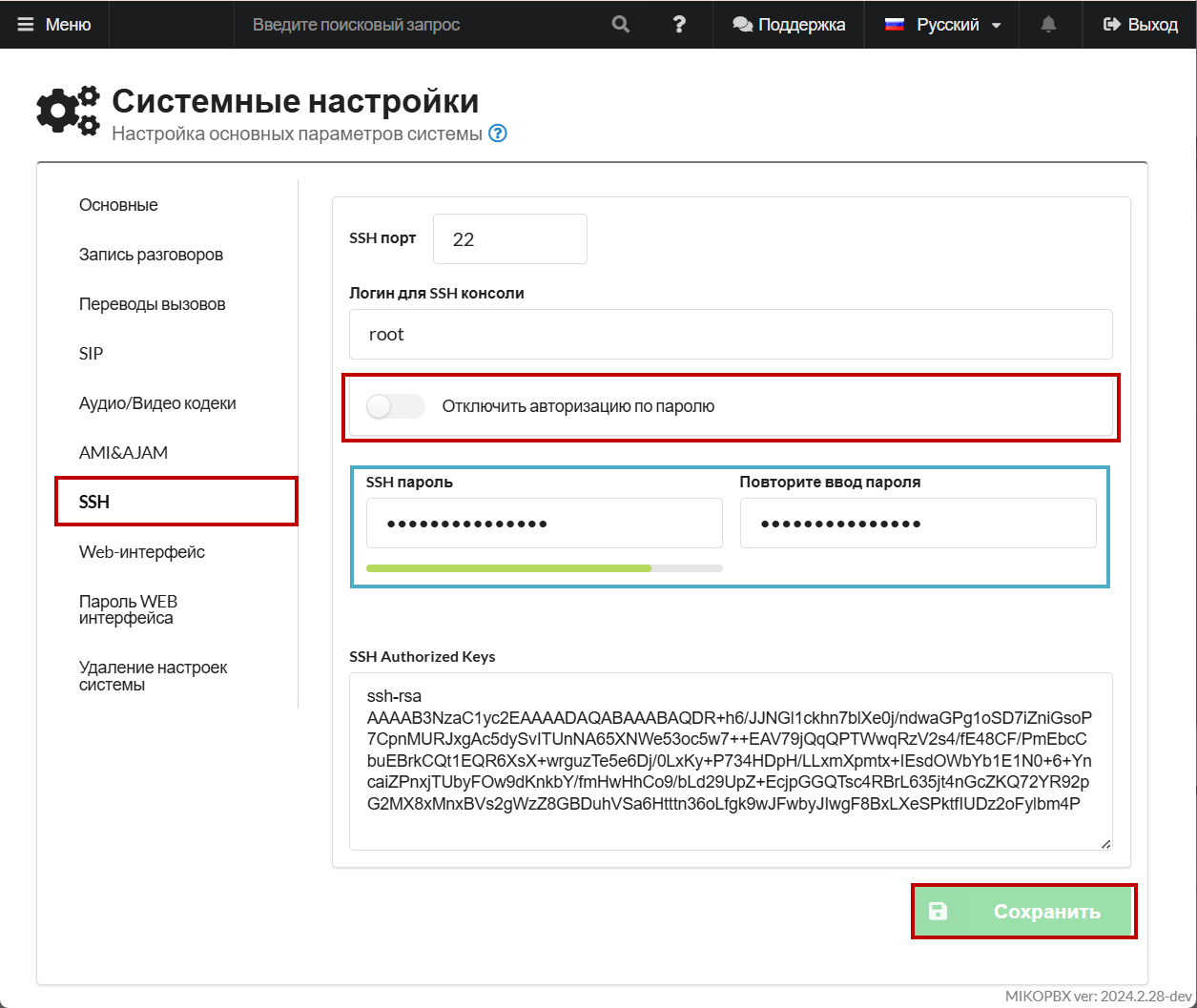 2. Перейдите в раздел "**SSH**". Переключите тумблер "**Отключить авторизацию по паролю**" (По умолчанию в активном положении). Задайте Ваш пароль для SSH-подключения. Сохраните настройки.