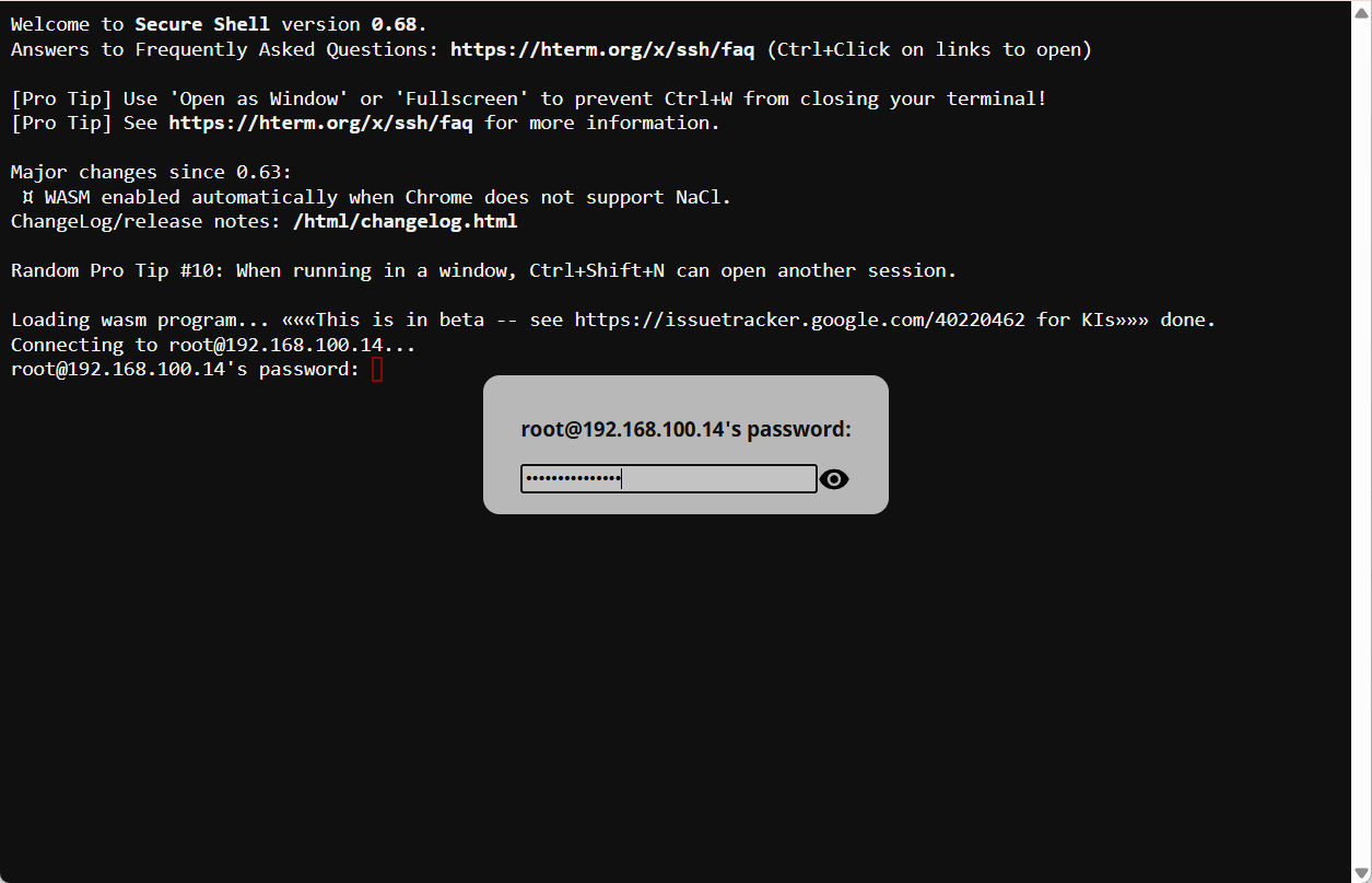 <figure><img src="https://3704471835-files.gitbook.io/~/files/v0/b/gitbook-x-prod.appspot.com/o/spaces%2F-MPK4TuzRBnP7rt8htho-887967055%2Fuploads%2F6RhMRP3k3buc1mq8szX1%2FsuccessfulSSHConnectionGSS.png?alt=media&#x26;token=cfe3762a-bd86-47ea-9c5f-3e011c938380" alt=""><figcaption><p>Успешное SSH-подключения через Google Secure Shell.</p></figcaption></figure>