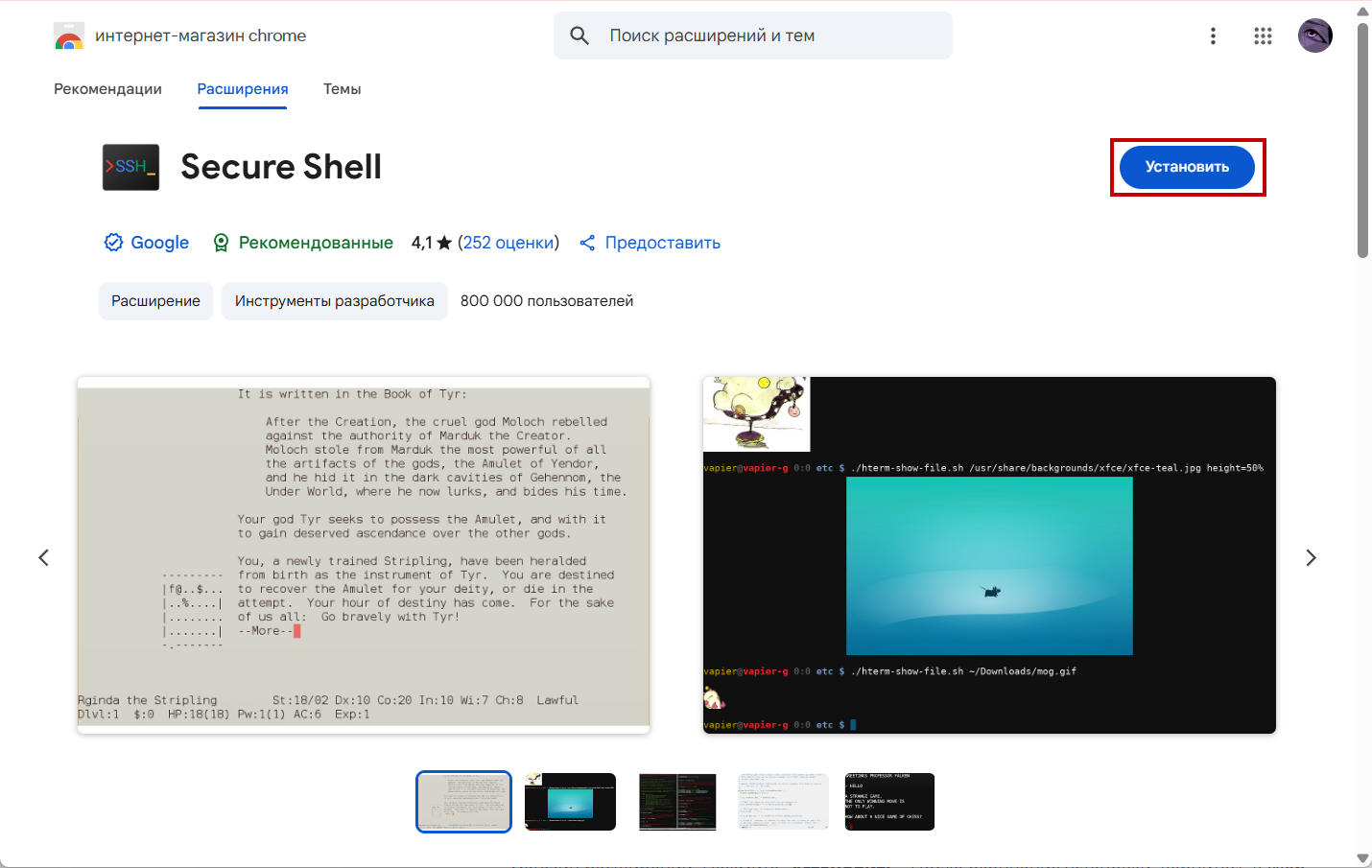 2. В случае, если у Вас не установлено расширение "Secure Shell" для браузера, Вас переадресует в магазин расширений. Нажмите "**Установить**". После окончания установки, вернитесь в Web-интерфейс и повторите **первый** шаг.