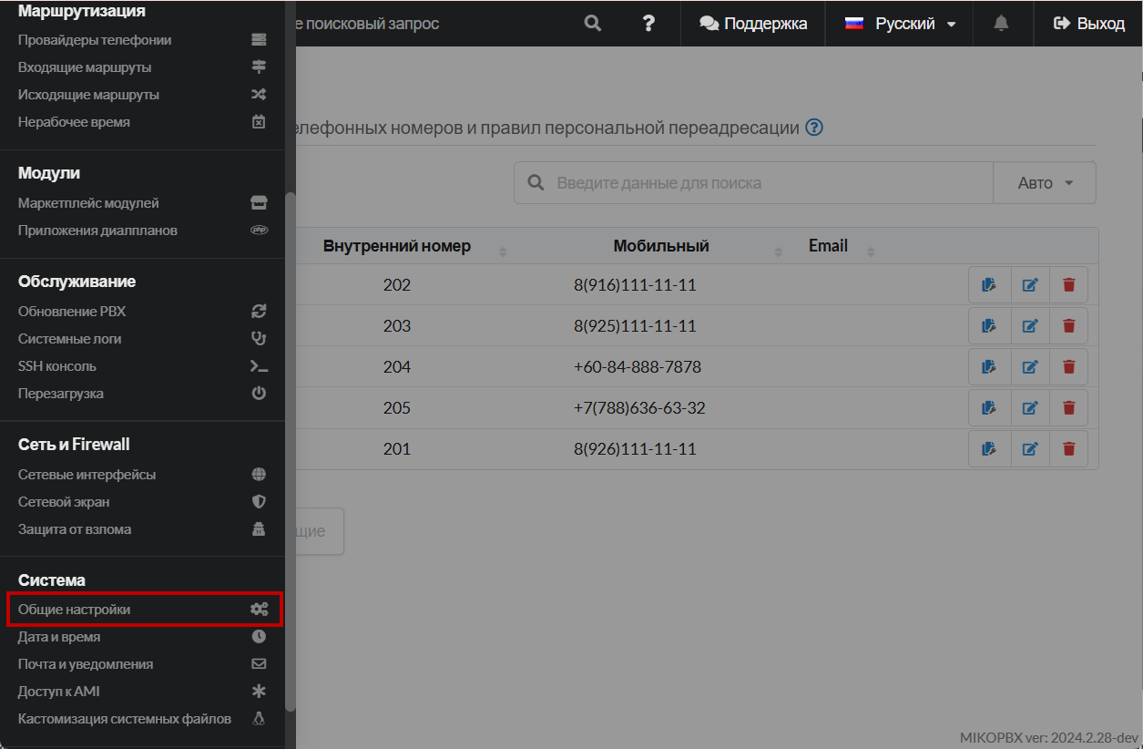 <figure><img src="https://3704471835-files.gitbook.io/~/files/v0/b/gitbook-x-prod.appspot.com/o/spaces%2F-MPK4TuzRBnP7rt8htho-887967055%2Fuploads%2Fwgo1slCwgTw5iEwoC5Rw%2FgeneralSettingsSectionMikoPBXWEB.png?alt=media&#x26;token=3584bca2-1c02-4f5a-87fe-fef4d1470d72" alt=""><figcaption><p>Раздел "Система" - "Общие настройки"</p></figcaption></figure>