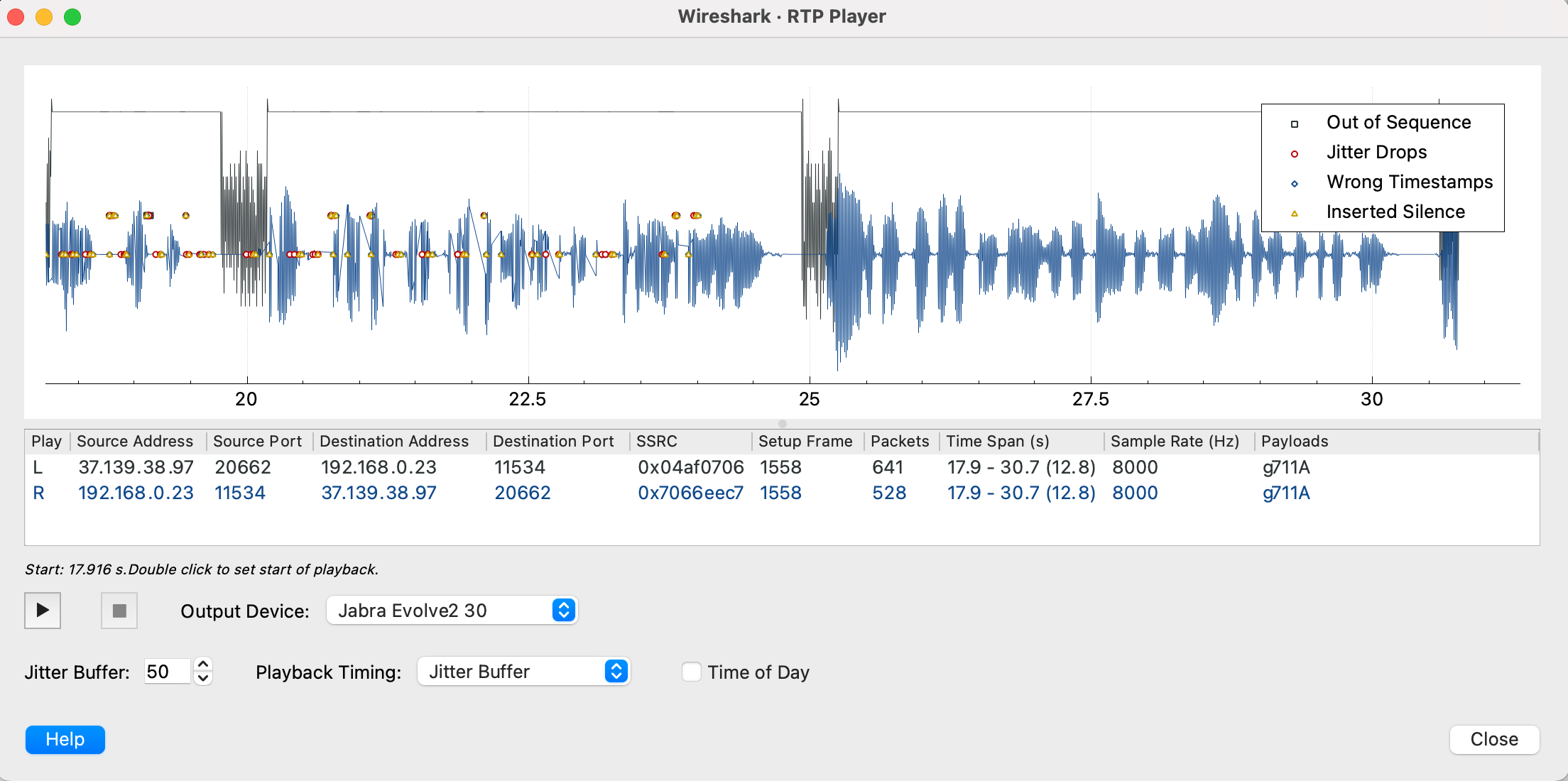 На изображении видны "**красно-желтые точки**". Фактически, это "отброшенные пакеты", которые не будут воспроизведены клиенту. В данном случае при увеличении значения **Jitter Buffer** до **800**, звук выравнивался, заикания пропадали.