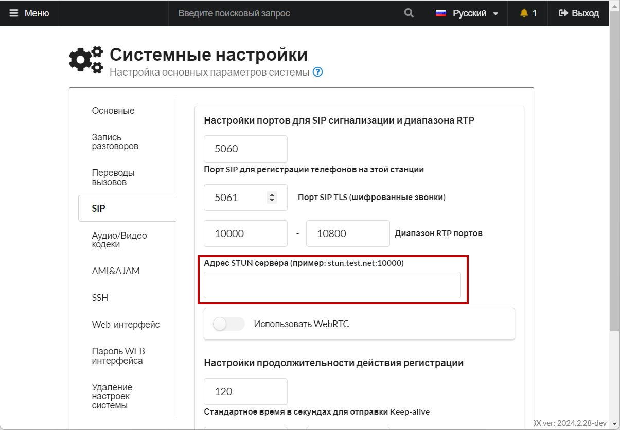 В версиях АТС **2021.4.1+** появилась возможность прописать **stun** сервер, он необходим для корректного определения внешнего адреса, и на моей практике, пригодился для корректной работы webRTC клиента:
