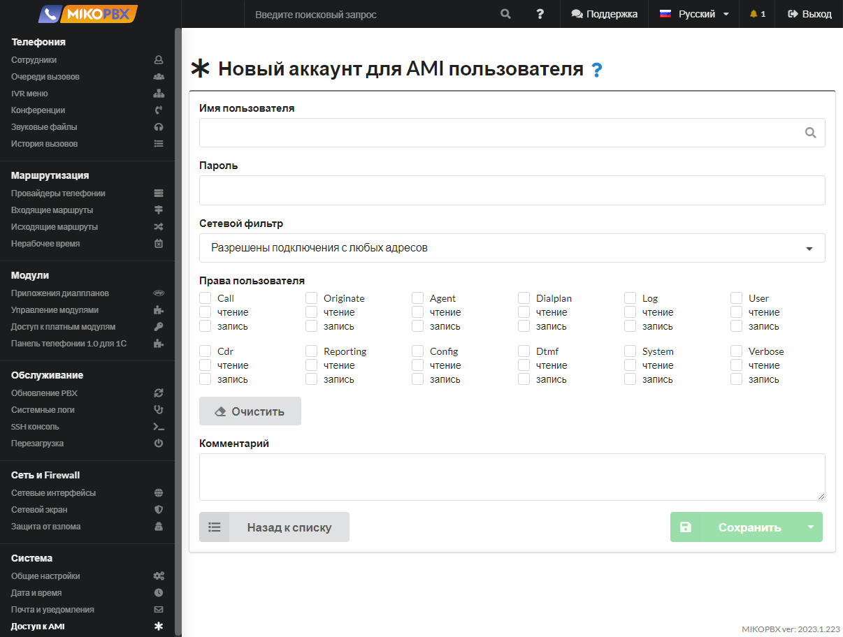 Для добавления новой учетной записи необходимо указать **Имя пользователя** и **Пароль**. Кроме того, необходимо задать **Сетевой фильтр**, т.е. из какой подсети разрешено подключение к пользователю AMI. Вы можете разрешить подключения с любых адресов, либо указать конкретную сеть, настройку который Вы произвели в разделе **"Сеть и Firewall" → "**[**Сетевой экран**](https://docs.mikopbx.com/mikopbx/manual/connectivity/firewall)**"**.