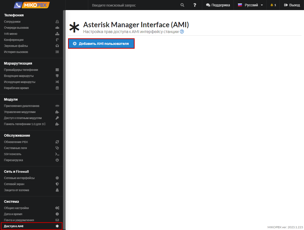 Первое что необходимо сделать, это включить AMI и завести пользователя, с помощью которого клиентская программа будет аутентифицироваться. «**Система**» - «**Доступ к AMI**»