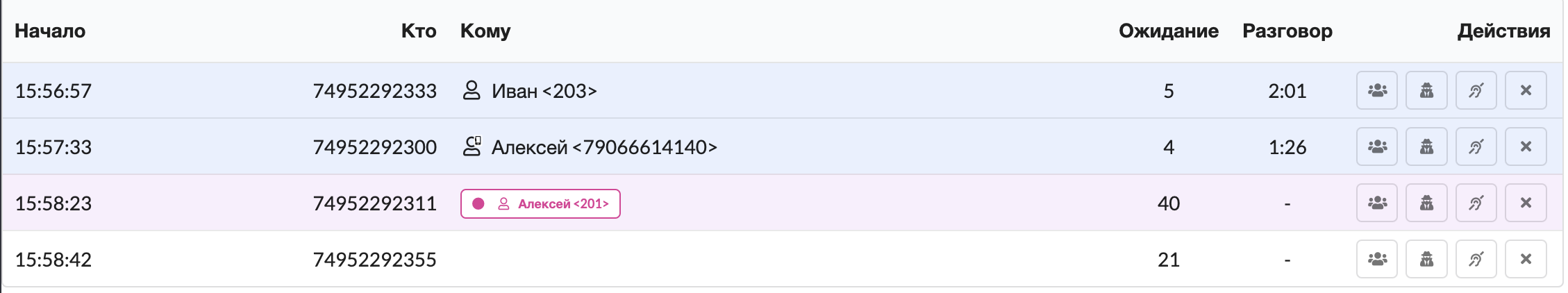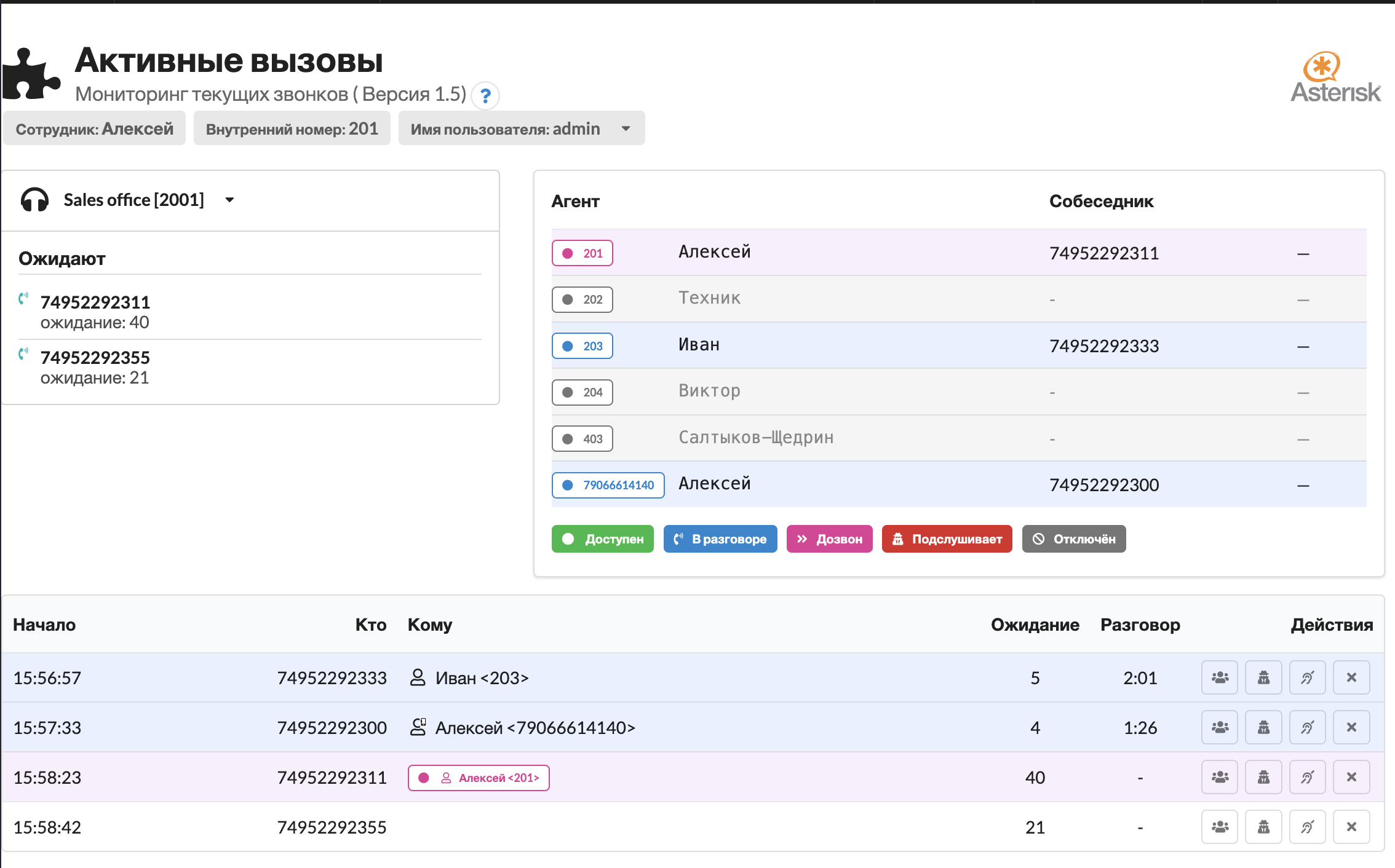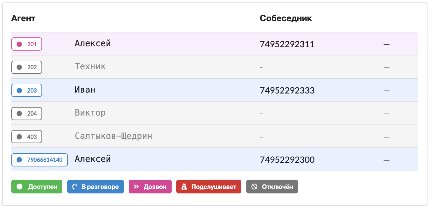 Цветом подсвечивается статус звонка. Одна строка отображает один звонок. В рамках одого звонка может быть множество активных каналов, связанных с сотрудником.&#x20;