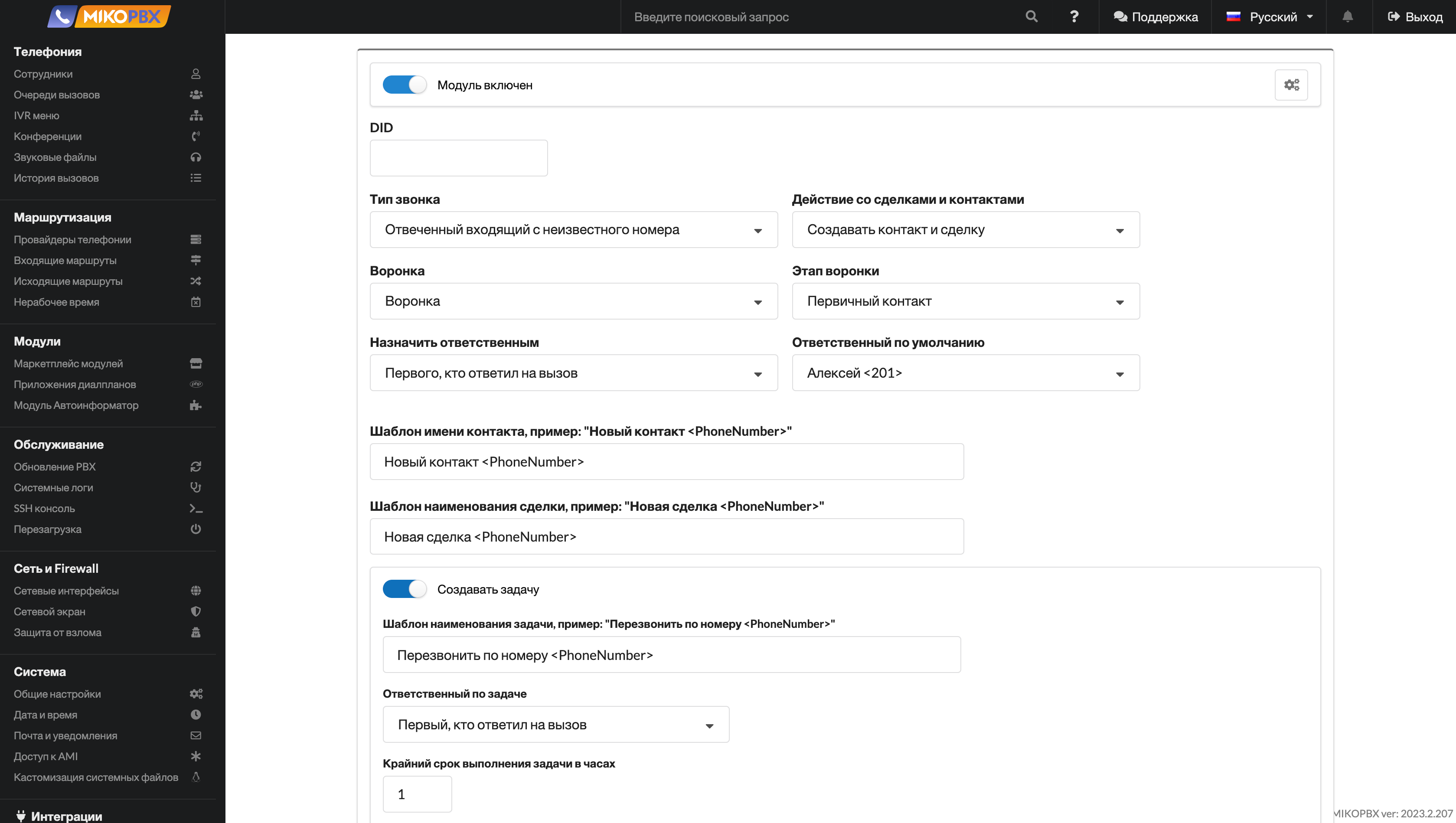 * *Ответственный по задаче* - задача будет создана только в том случае, если удалось определить ответственного. Варианты: «первый, кто ответил на вызов», «последний, кто ответил на вызов», «ответственный по умолчанию»