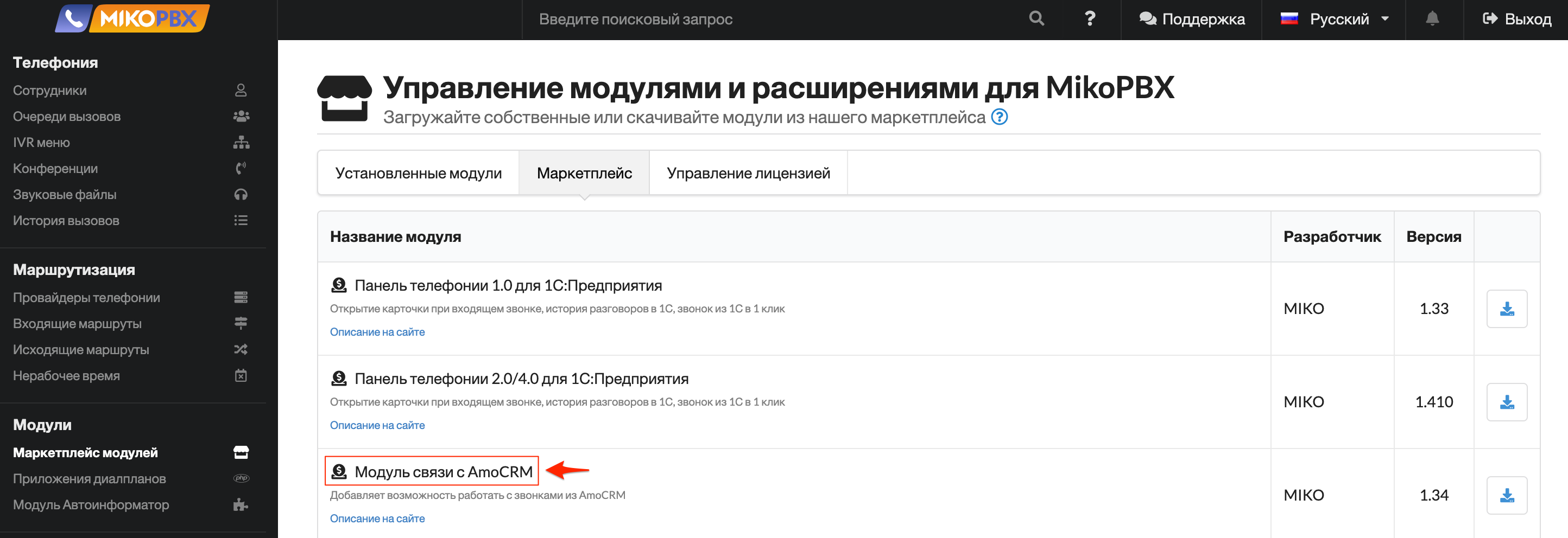 1. Откройте web-интерфейс MikoPBX. Перейдите в раздел «**Модули**» - «**Маркетплейс модулей**».