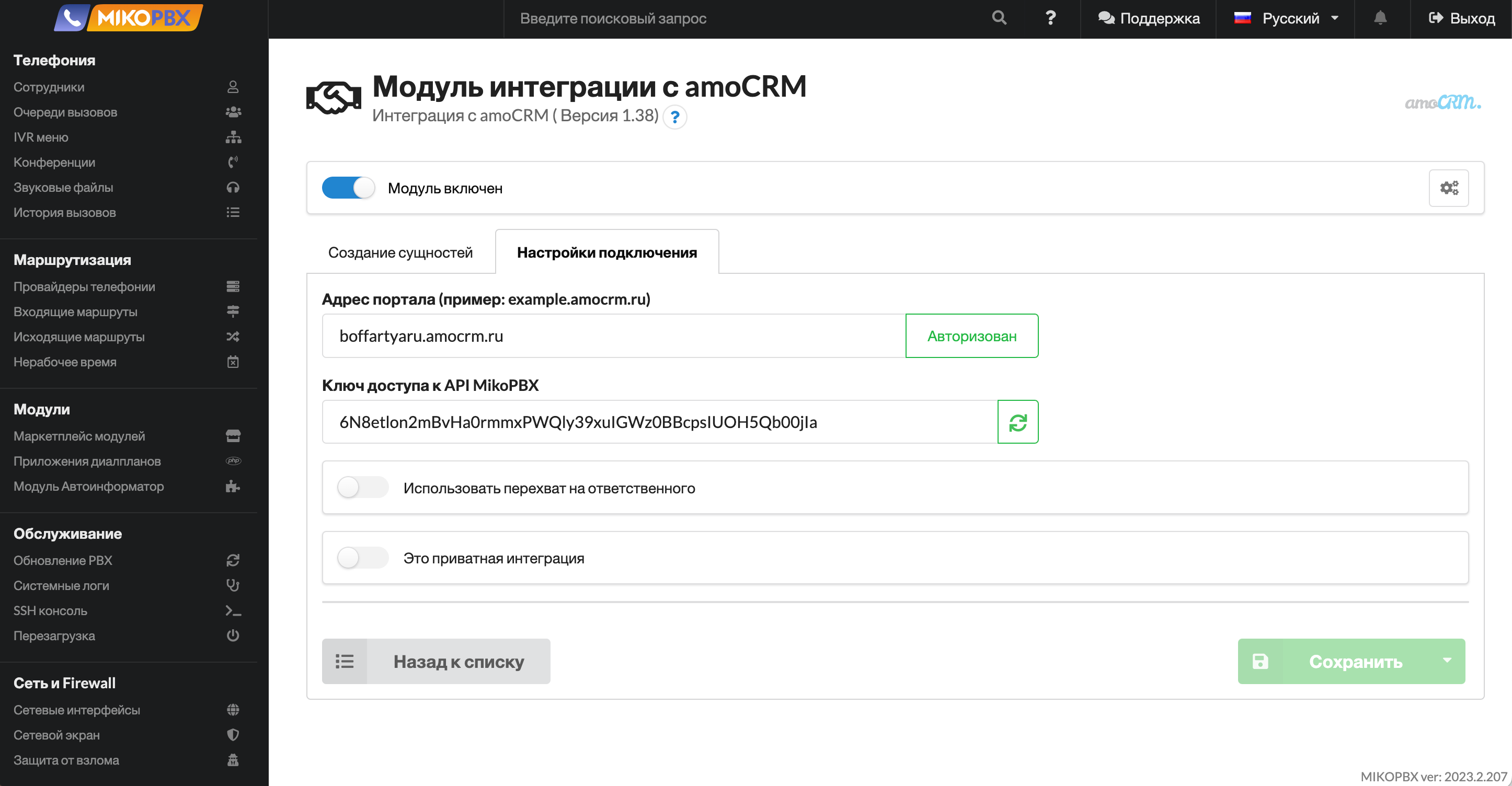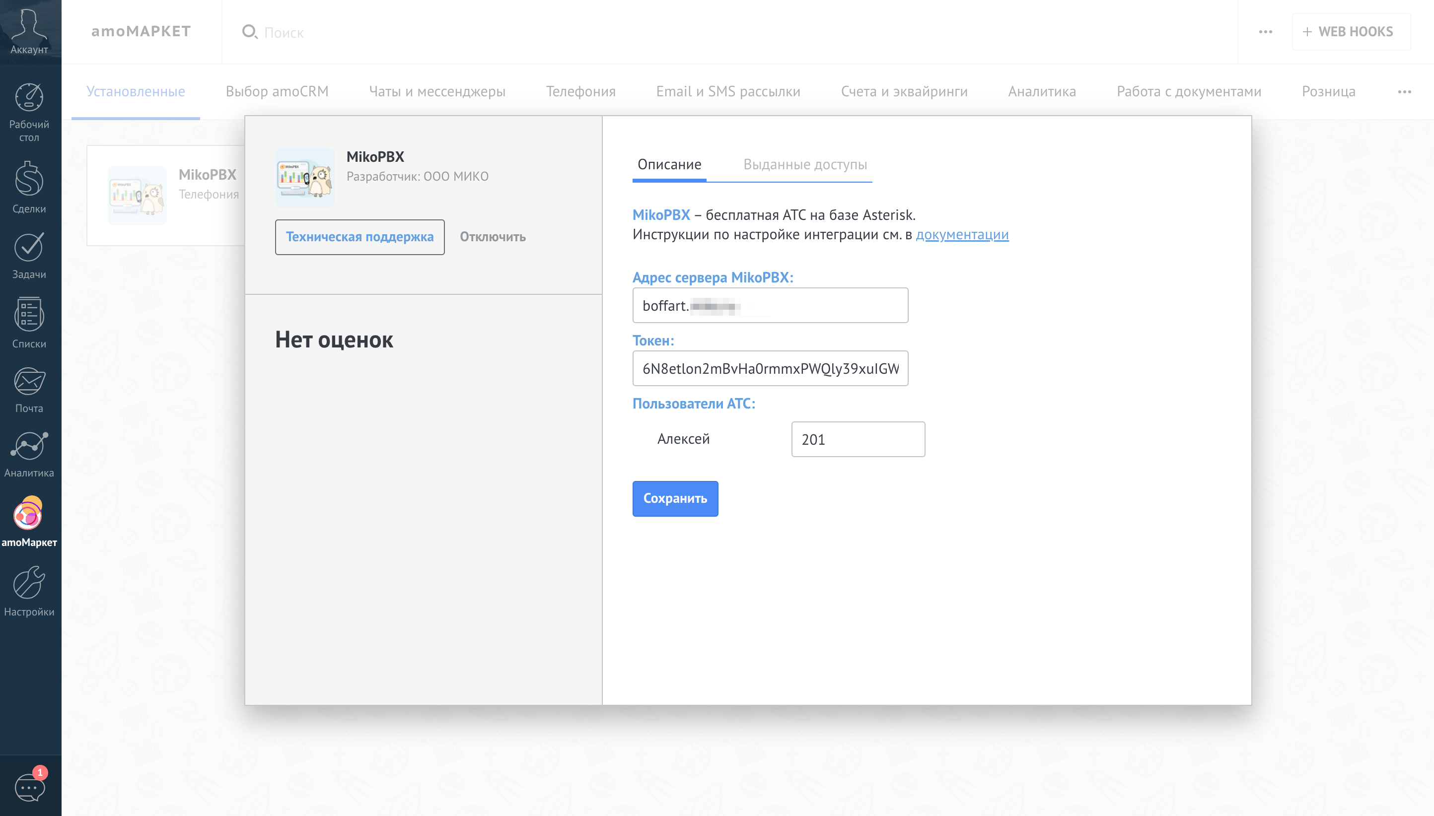 5. Заполните «**Токен**», его значение следует взять из настроек АТС «**Ключ доступа к API MikoPBX**».