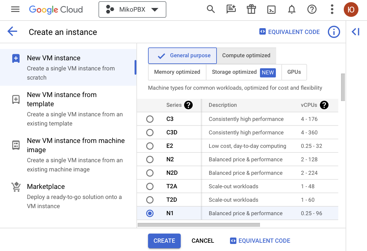 В таблице Machine configuration / General purpose выберите Series - N1