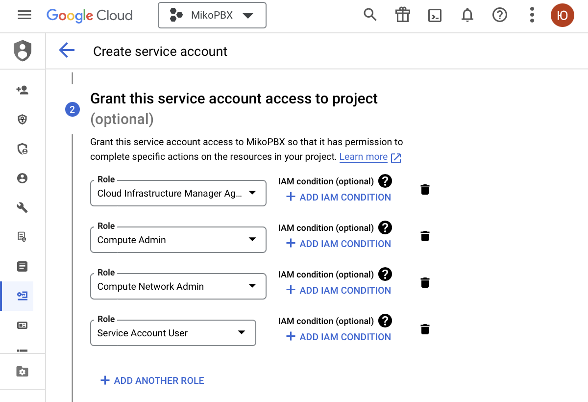 5. Добавьте роли **Cloud Infrastructure Manager Agent, Compute Admin, Compute Network Admin, Service Account User**