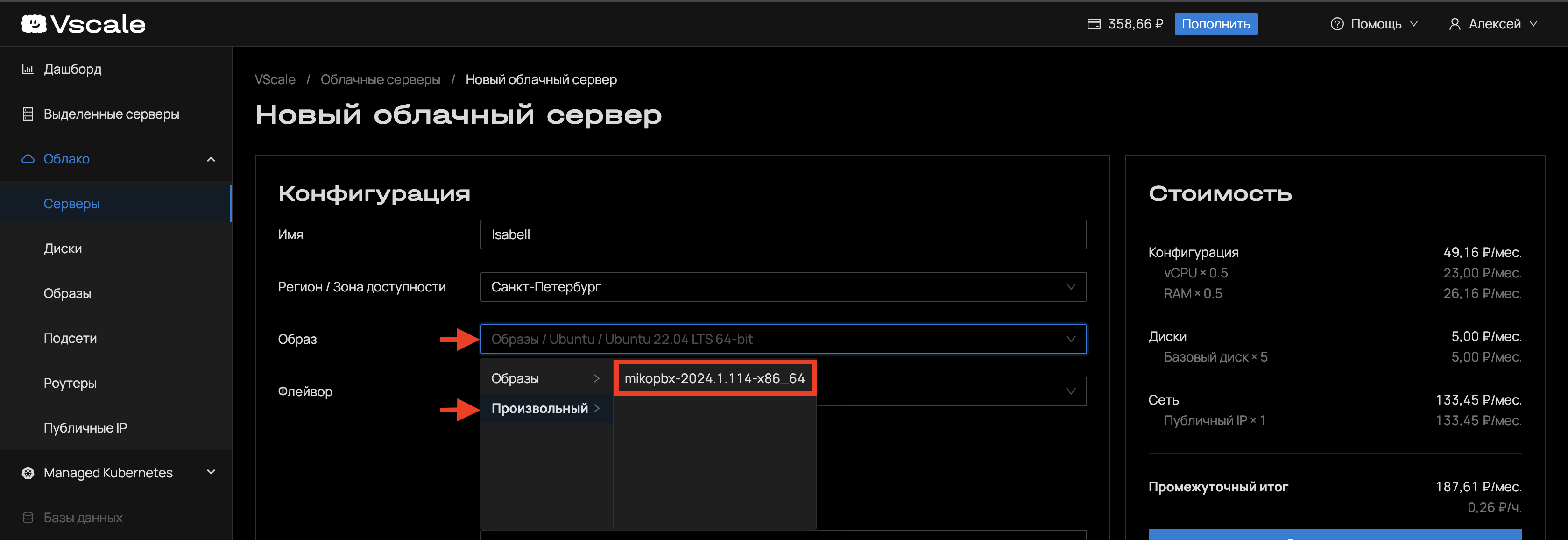3. В поле "**Флейвор**" выберите конфигурацию сервера