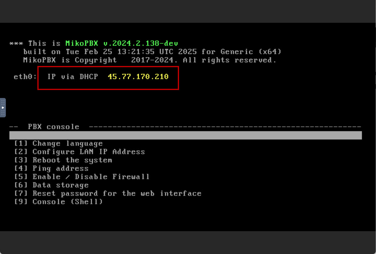 1. В адресную строку введите IP-адрес Вашей виртуальной машины. Найти его Вы можете в консоли MikoPBX.