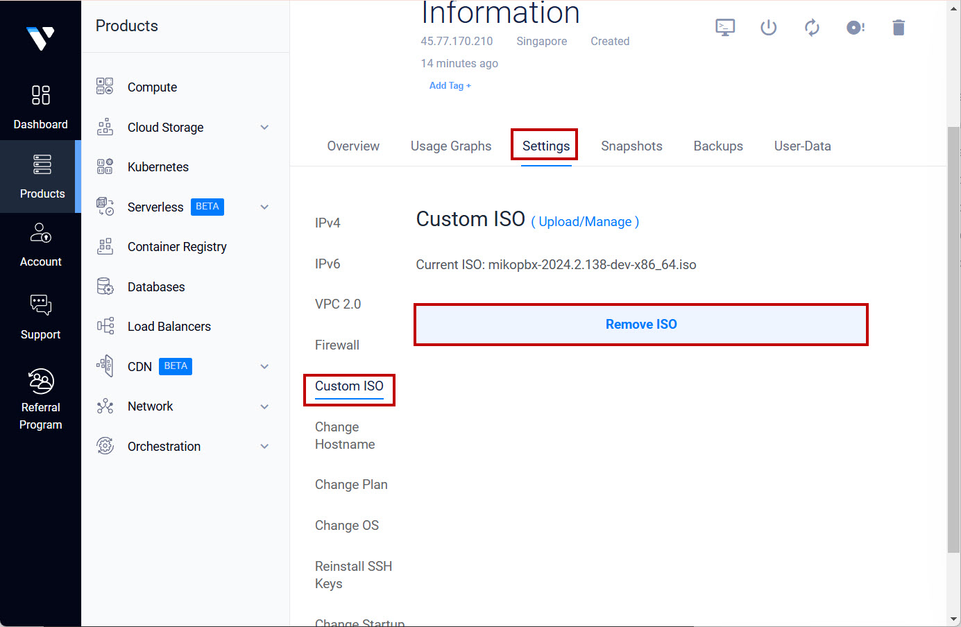 7. Перейдите в настройки виртуальной машины "**Settings**", далее в "**Custom ISO**". Нажмите "**Remove ISO**".