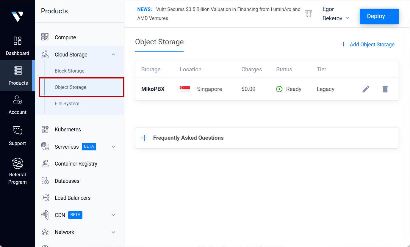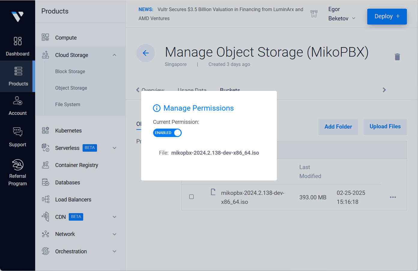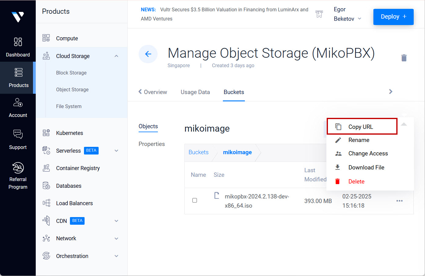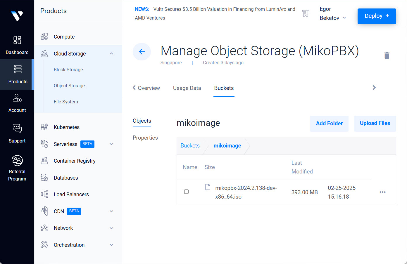 10. Вернитесь в интерфейс Vultr, перейдите в директорию Вашего Bucket'а.&#x20;